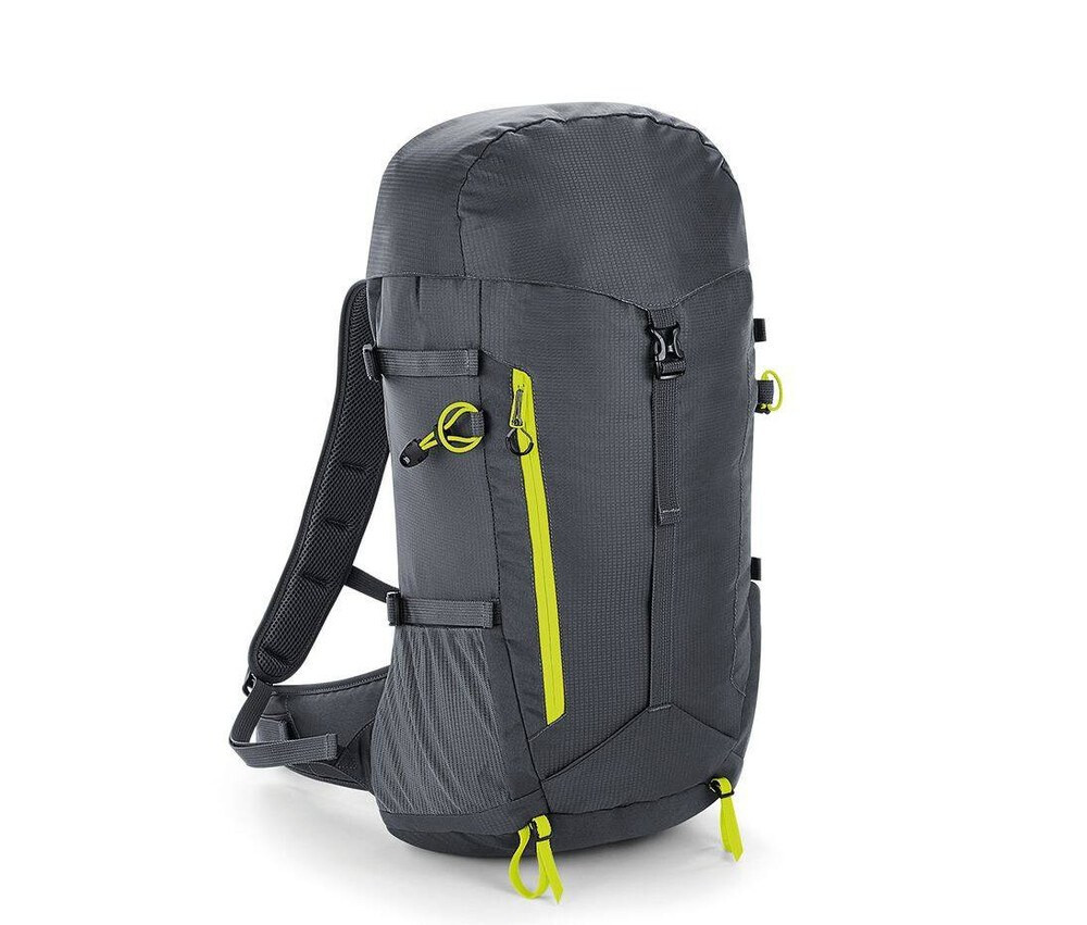 TearAway detachable label, easy to re-label. Ultra-light yet durable. Water pouch compatible. Easily accessible EasyPanel™ panel for embroidery. Attachment points for hiking poles. Waterproof fabric. Removable waterproof rain cover. Reflective parts. Internal patch pocket. Carabiner hook for keys. Elastic mesh side pockets. Lightweight outer frame. Thin ventilated back. Adjustable padded shoulder straps. Adjustable chest and abdominal support straps. Carrying handle.