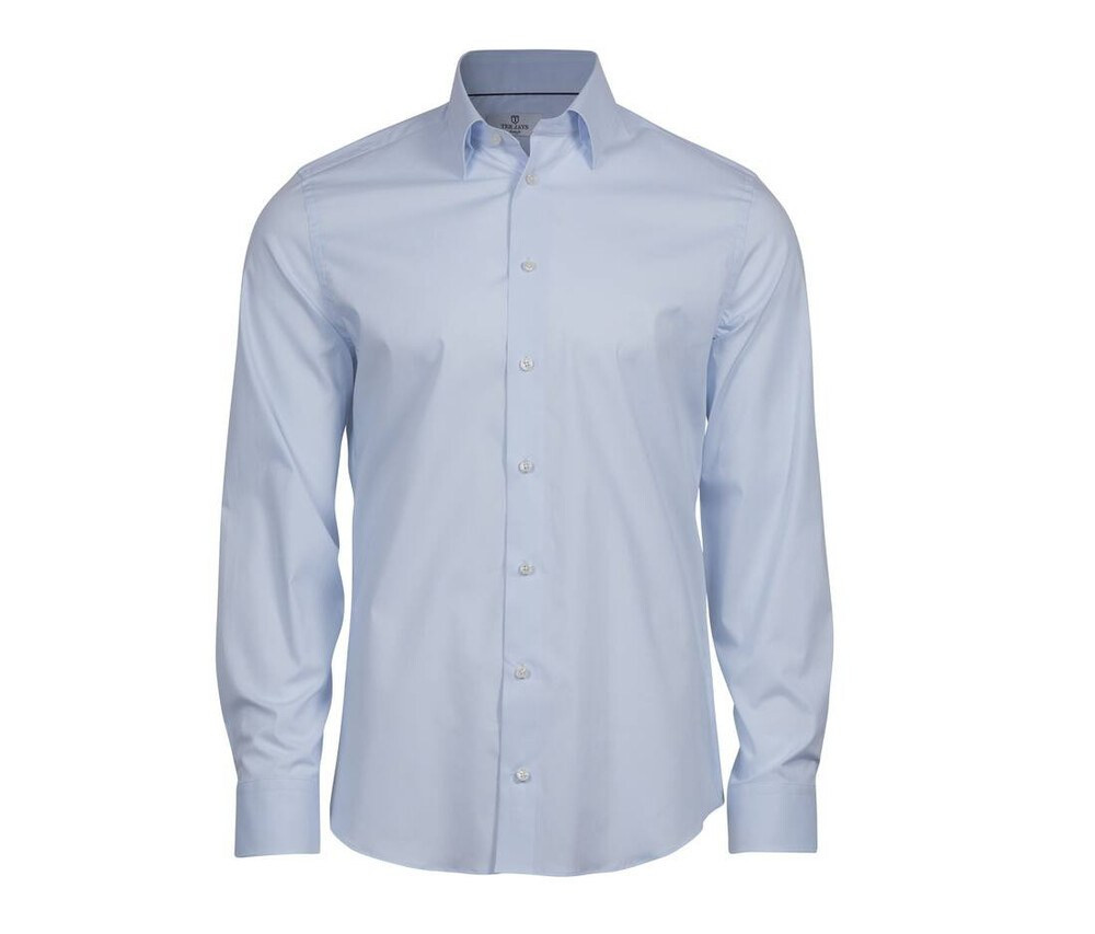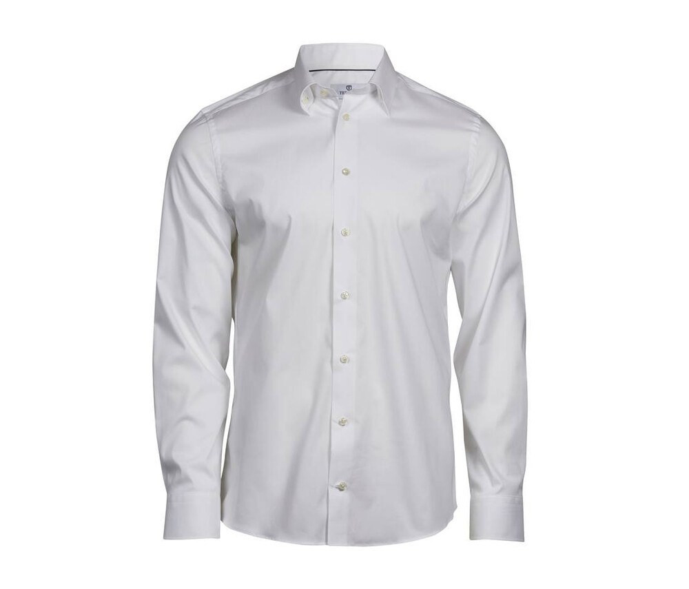 Shaped fit. Button down collar. Fused collar and cuffs. Back yoke. Darts on back. Curved hem.