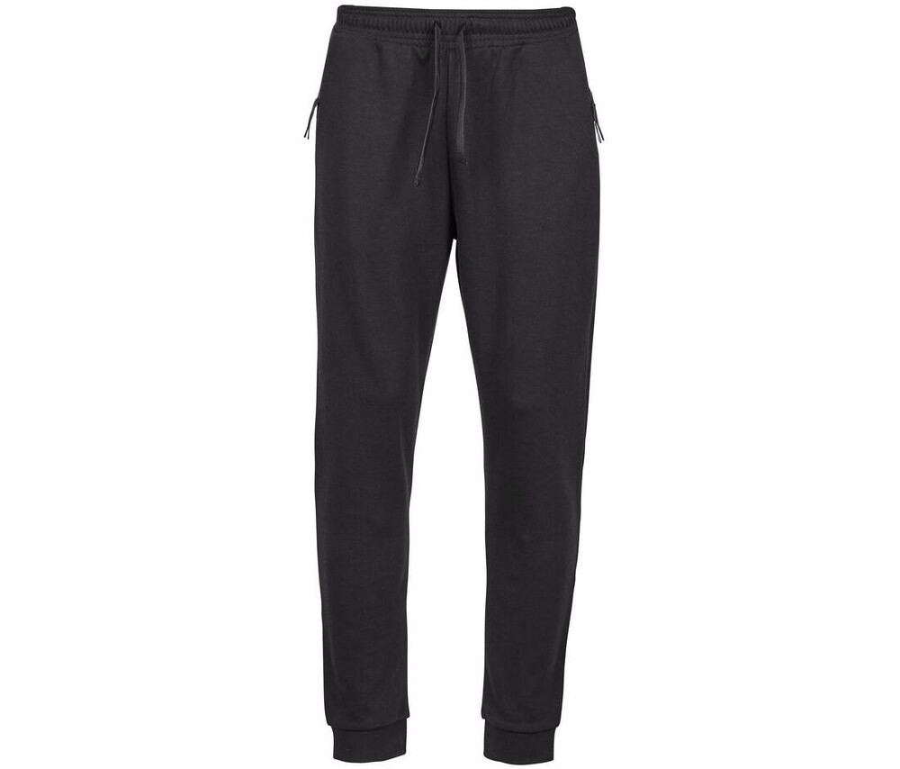 Elastic waist with string. Two front pockets with zippers. Self-fabric cuffs. SBS zippers.