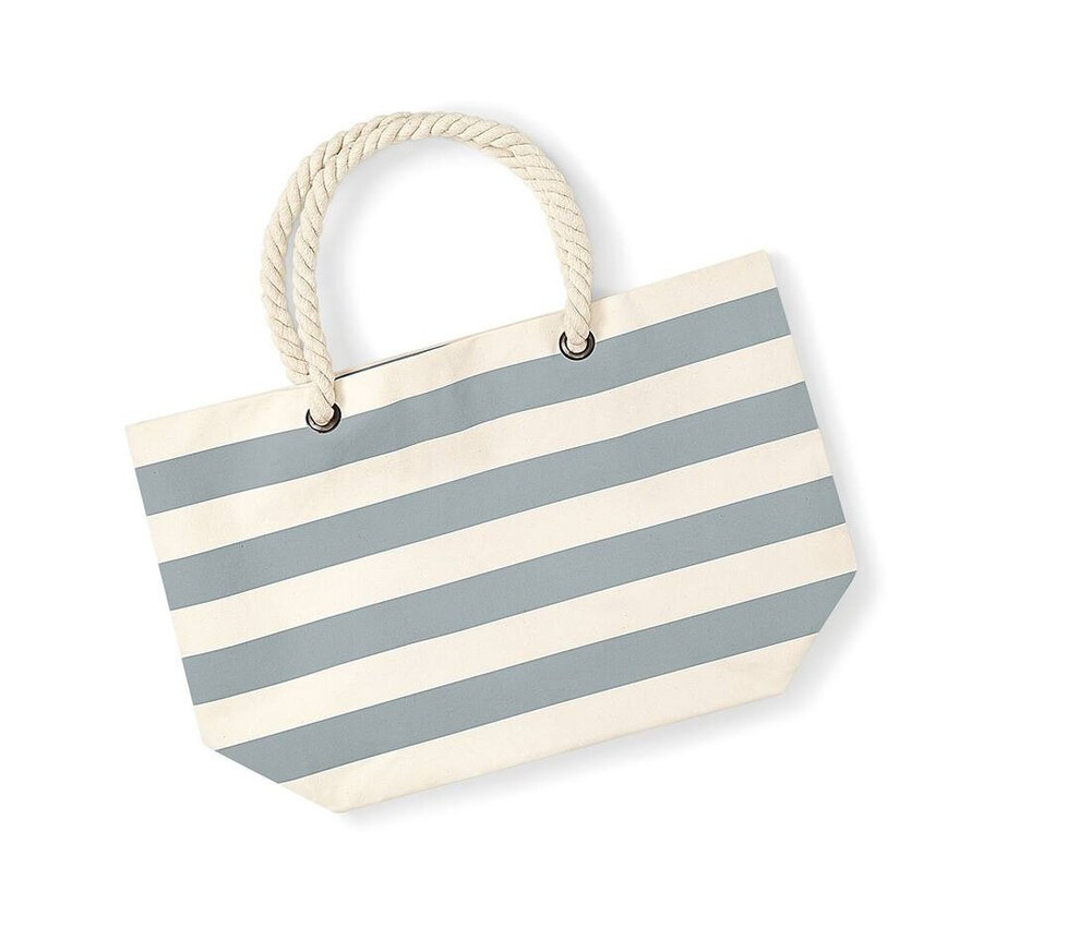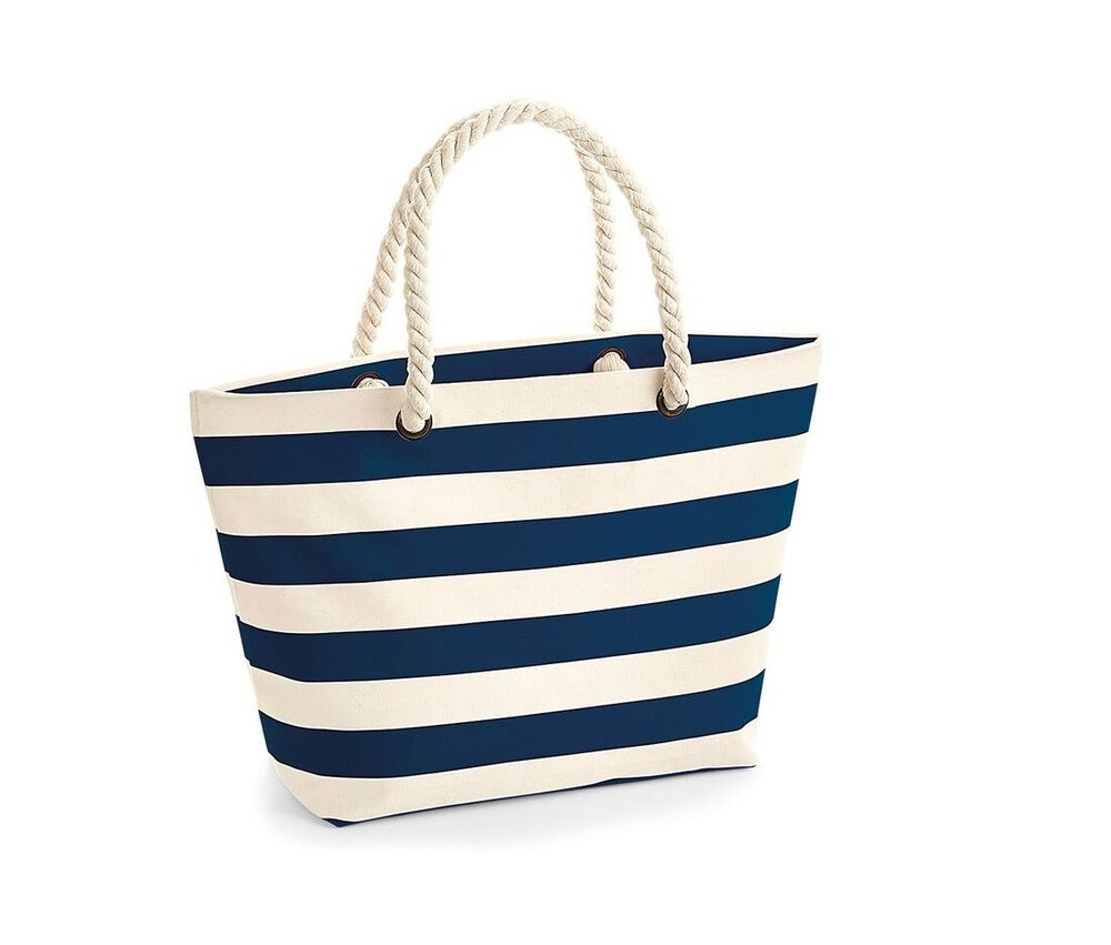 Printed strip design. Durable canvas construction. Heavyweight rope carry handles. Can be carried by hand or over the shoulder. Handle length: 60cm.